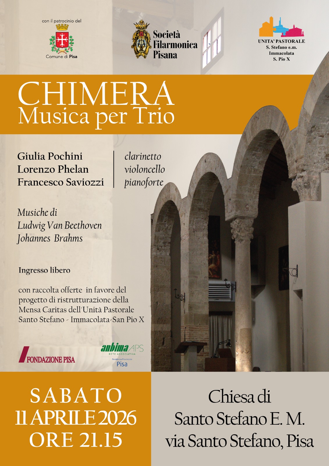 La Società Filarmonica Pisana invita tutti al concerto che si terrà sabato 11 aprile alle ore 21.15 a Pisa, nella chiesa di Santo Stefano e.m. (Via Santo Stefano 30) dal titolo Chimera- Musica per Trio. Ad esibirsi saranno i solisti e docenti della Filarmonica Pisana Giulia...leggi tutto |