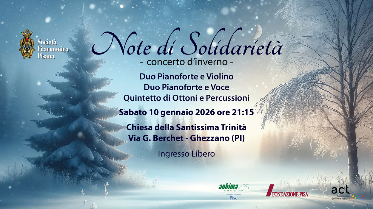 La Società Filarmonica Pisana invita tutti al Concerto d'Inverno per aprire in musica il Nuovo Anno. Ad esibirsi saranno delle formazioni di musica da camera, con lo scopo di unire Musica e Solidarietà. |