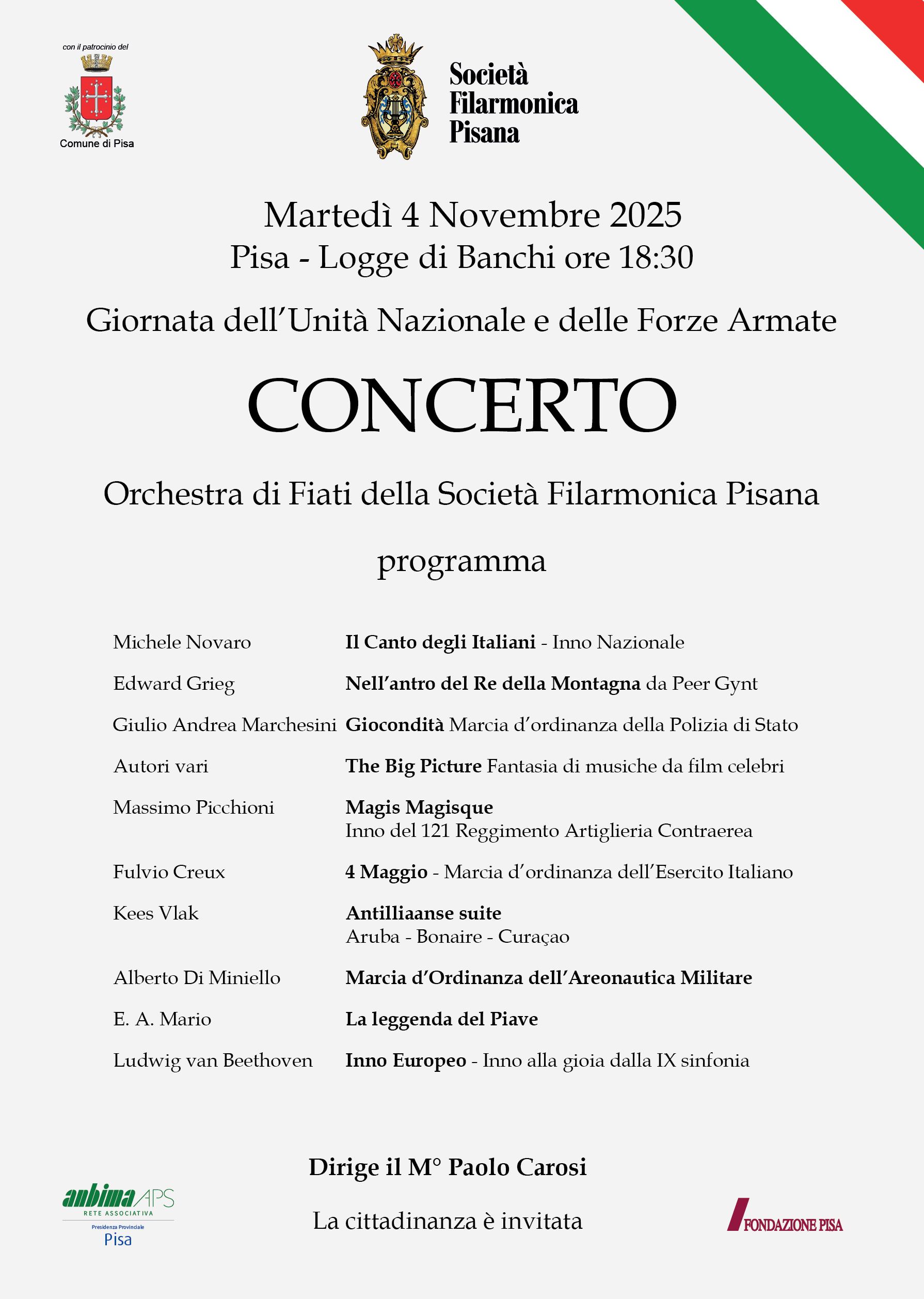 Tradizionale Concerto del IV Novembre 2025 dell’Orchestra di Fiati e Percussioni della Società Filarmonica Pisana diretta dal M. Paolo Carosi per la Festa dell’Unità d’Italia e delle forze armate 2025.