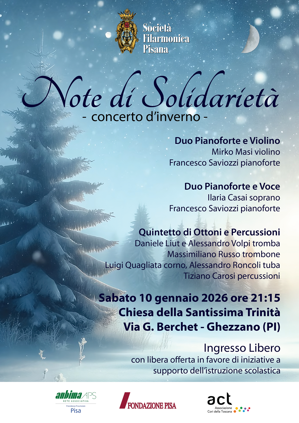 La Società Filarmonica Pisana invita tutti al Concerto d'Inverno per aprire in musica il Nuovo Anno. Ad esibirsi saranno delle formazioni di musica da camera, con lo scopo di unire Musica e Solidarietà.